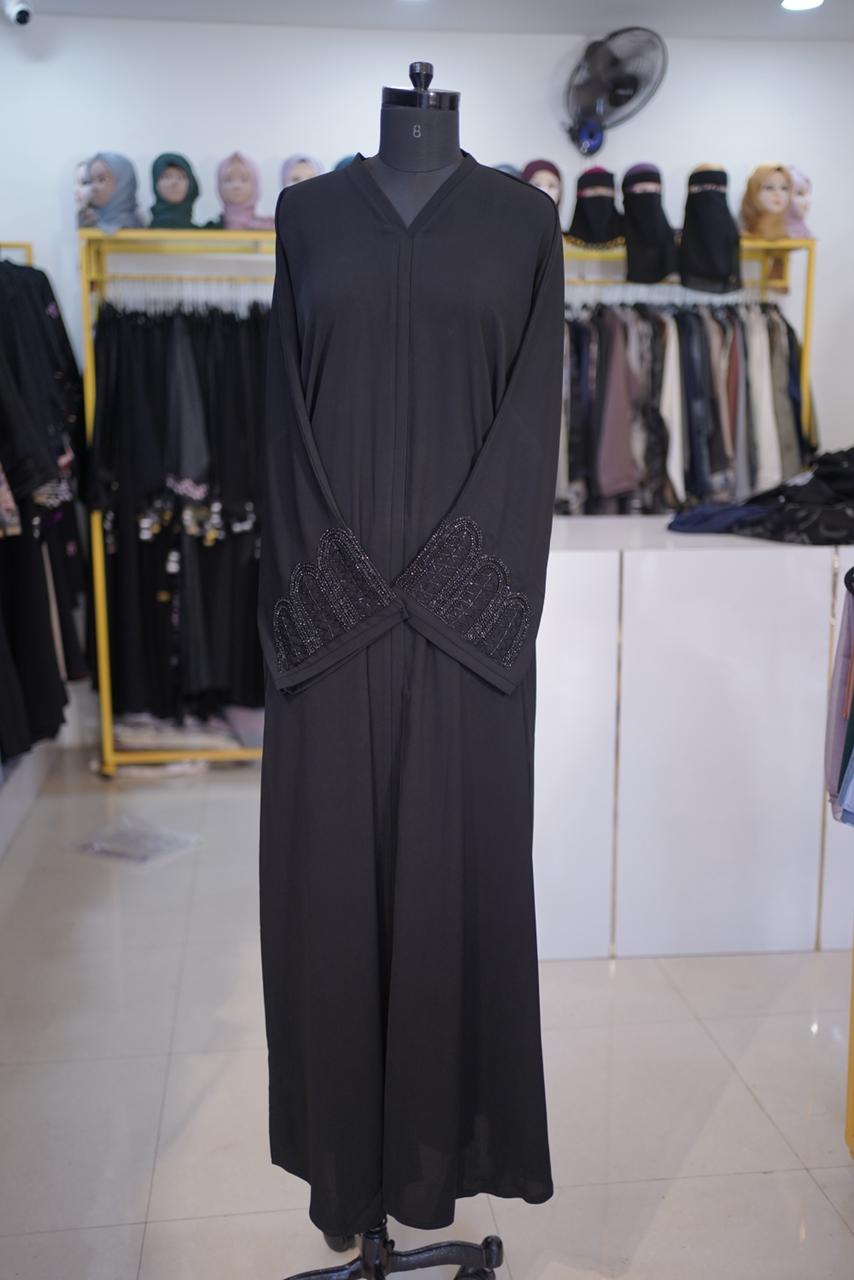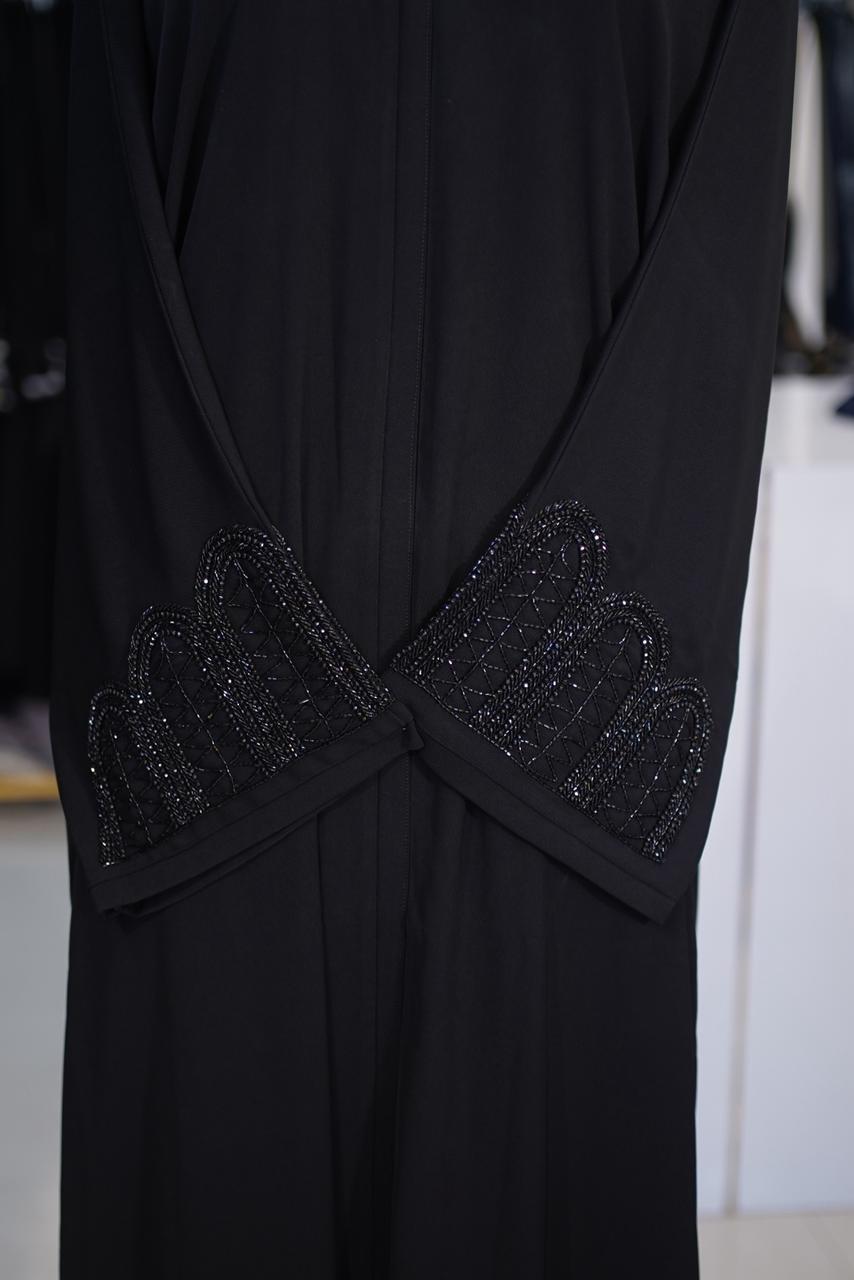 The defining feature of this abaya is the Heavy Hand-Work on the Sleeves. Unlike scattered designs, this model features a concentrated, high-density pattern of hand-stitched motifs on the cuffs and forearms. This creates a stunning visual focal point while keeping the rest of the abaya sleek and understated.