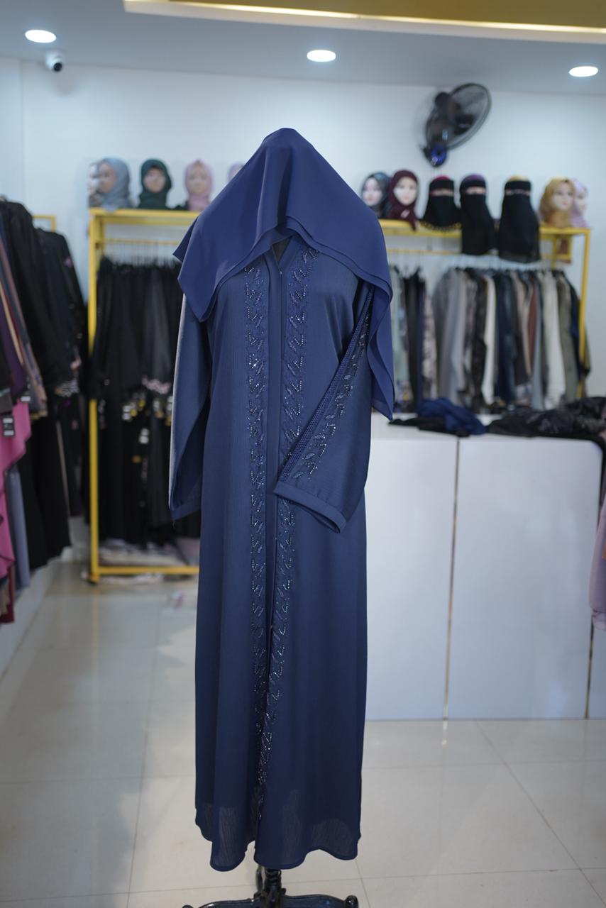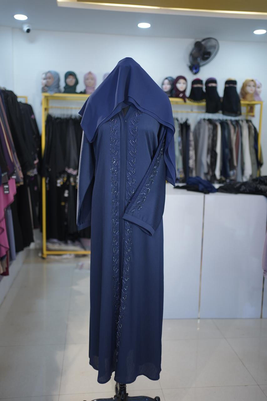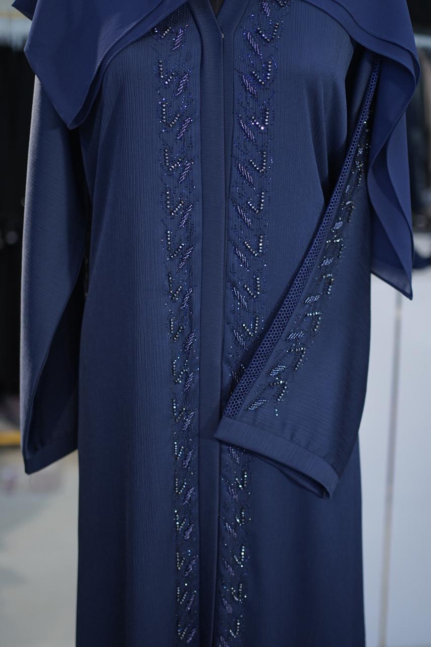 Experience deep, midnight elegance with the Navy Blue Zwom Abaya. A centerpiece of the Maftha Lounge luxury line, this imported-style garment combines a rich color palette with complex sleeve artistry, designed for the woman who appreciates “Quiet Luxury” with a touch of sparkle.